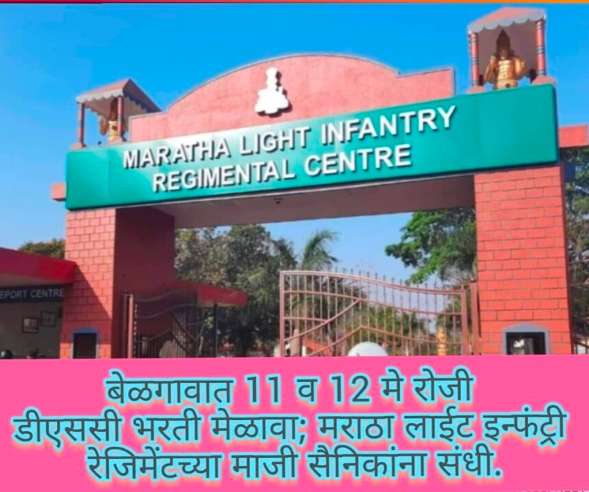 बेळगावात 11 व 12 मे रोजी डीएससी भरती मेळावा; मराठा लाईट इन्फंट्री रेजिमेंटच्या माजी सैनिकांना संधी. ಬೆಳಗಾವಿಯಲ್ಲಿ ಮೇ 11 ಮತ್ತು 12 ರಂದು ಡಿಎಸ್ಸಿ ನೇಮಕಾತಿ ಮೇಳ; ಮರಾಠಾ ಲೈಟ್ ಇನ್ಫ್ಯಾಂಟ್ರಿ ರೆಜಿಮೆಂಟ್ನ ಮಾಜಿ ಸೈನಿಕರಿಗೆ ಸುವರ್ಣಾವಕಾಶ.