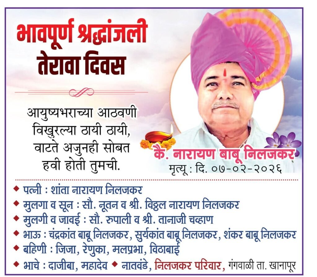 Uncategorized Last updated: 2026/02/19 at 6:32 AM Dinkar Margale Share 0 Min Read SHARE You Might Also Like अपघातग्रस्त कुमार वैभव सुतार यास विश्वकर्मा समाजाची आर्थिक मदत; एकूण 21 हजार रुपयांचा धनादेश सुपूर्द- ಅಪಘಾತಕ್ಕೊಳಗಾದ ಕುಮಾರ ವೈಭವ ಸುತಾರ್ ಅವರಿಗೆ ವಿಶ್ವಕರ್ಮಾ ಸಮಾಜದ ವತಿಯಿಂದ ಆರ್ಥಿಕ ಸಹಾಯ; ಒಟ್ಟು 21 ಸಾವಿರ ರೂ.ಗಳ ಚೆಕ್ ಹಸ್ತಾಂತರ. February 17, 2026 खानापूर शहरांतर्गत रस्त्याची हद्द मोजणी व मार्किंग 2 व 3 फेब्रुवारीला-ಖಾನಾಪುರ ನಗರಾಂತರ್ಗತ ರಸ್ತೆ ಅಗಲೀಕರಣ ಕಾರ್ಯಕ್ಕೆ ಅಡ್ಡಿ ಉಂಟು ಆಗುತ್ತಿರುವ ರಸ್ತೆಗಳ ಗಡಿ ಮಾಪನ ಹಾಗೂ ಮಾರ್ಕಿಂಗ್ ಫೆಬ್ರವರಿ 2 ಮತ್ತು 3ರಂದು. हुतात्मा दिनी कडकडीत हरताळ पाळण्याचे दोन्ही महाराष्ट्र एकीकरण समितीच्या वतीने आवाहन-ಹುತಾತ್ಮ ದಿನದಂದು ಸಂಪೂರ್ಣ ಬಂದ್ ಪಾಲಿಸಲು ಎರಡೂ ಖಾನಾಪುರ ತಾಲ್ಲೂಕು ಮಹಾರಾಷ್ಟ್ರ ಏಕೀಕರಣ ಸಮಿತಿಗಳ ಸಭೆಯಲ್ಲಿ ತಿರ್ಮಾನ. Sign Up For Daily NewsletterBe keep up! Get the latest breaking news delivered straight to your inbox.[mc4wp_form]By signing up, you agree to our Terms of Use and acknowledge the data practices in our Privacy Policy. You may unsubscribe at any time. Dinkar Margale February 19, 2026 Share this Article Facebook Twitter Whatsapp Whatsapp LinkedIn Telegram Email Copy Link Share Previous Article शेडेगाळी येथील श्री रवळनाथ भजनी भारुड मंडळाचे पुनरुज्जीवन ; आमदारांचा सत्कार-ಶೇಡೆಗಾಳಿ ಗ್ರಾಮದ ಶ್ರೀ ರವಳನಾಥ ಭಜನಿ ಭಾರೂಡ್ ಮಂಡಳಿಯ ಪುನರುಜ್ಜೀವನ; ಶಾಸಕರಿಗೆ ಸತ್ಕಾರ. Leave a comment Leave a comment Leave a Reply Cancel replyYour email address will not be published. Required fields are marked *Comment * Name * Email * Website Save my name, email, and website in this browser for the next time I comment. ADS HERELatest News February 19, 2026 शेडेगाळी येथील श्री रवळनाथ भजनी भारुड मंडळाचे पुनरुज्जीवन ; आमदारांचा सत्कार-ಶೇಡೆಗಾಳಿ ಗ್ರಾಮದ ಶ್ರೀ ರವಳನಾಥ ಭಜನಿ ಭಾರೂಡ್ ಮಂಡಳಿಯ ಪುನರುಜ್ಜೀವನ; ಶಾಸಕರಿಗೆ ಸತ್ಕಾರ. जटगे गावात समाजोपयोगी उपक्रमांचा आदर्श ; युवकांकडून बसस्टॉप शेड व ‘श्री सिद्धेश्वर मठ देवस्थान’ प्रवेशद्वार कमान उभारणी..ಜಟಗೇ ಗ್ರಾಮದಲ್ಲಿ ಸಮಾಜೋಪಯೋಗಿ ಕಾರ್ಯಗಳ ಆದರ್ಶ ; ಯುವಕರಿಂದ ಬಸ್ಸ್ಟಾಪ್ ಶೆಡ್ ಹಾಗೂ ‘ಶ್ರೀ ಸಿದ್ಧೇಶ್ವರ ಮಠ ದೇವಸ್ಥಾನ’ ಪ್ರವೇಶದ್ವಾರ ಕಮಾನು ನಿರ್ಮಾಣ.. गुंजी जवळील अपघातग्रस्त वैभव सुतारला ‘Aurobindo Pharma Foundation’कडून 3.50 लाखांची आर्थिक मदत; आकाश बांदोडकर यांचे विशेष योगदान-ಗುಂಜಿ ಸಮೀಪದ ಅಪಘಾತಗ್ರಸ್ತ ವೈಭವ ಸುತಾರ ಅವರಿಗೆ ‘Aurobindo Pharma Foundation’ ವತಿಯಿಂದ ₹3.50 ಲಕ್ಷ ಆರ್ಥಿಕ ನೆರವು; ಆಕಾಶ ಬಾಂದೋಡ್ಕರ್ ಅವರ ವಿಶೇಷ ಪ್ರಯತ್ನ.