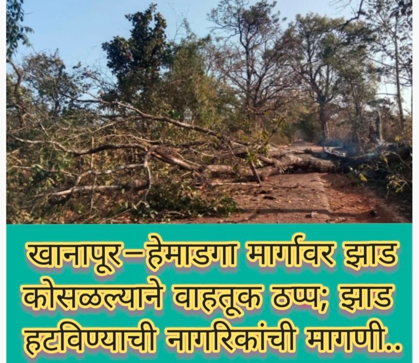 खानापूर–हेमाडगा मार्गावर झाड कोसळल्याने वाहतूक ठप्प; झाड हटविण्याची नागरिकांची मागणी.