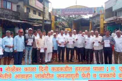 1 नोव्हेंबर काळा दिनी कडकडीत हरताळ पाळा – म. ए. समितीचे आवाहन जांबोटीत जनजागृती फेरी व पत्रकांचे वाटप – ನವೆಂಬರ್ 1ರಂದು ಕಪ್ಪು ದಿನವನ್ನು ಕಟ್ಟುನಿಟ್ಟಾಗಿ ಪಾಲಿಸಿ – ಎಮ.ಎ. ಸಮಿತಿ ವತಿಯಿಂದ ಕರೆ ಜಾಂಬೋಟಿಯಲ್ಲಿ ಜಾಗೃತಿ ಮೂಡಿಸುವ ಸಭೆಯನ್ನು ನಡೆಸಿ ಕರಪತ್ರಗಳ ವಿತರಣೆ