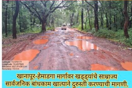 खानापूर-हेमाडगा रस्त्यावर खड्ड्यांचे साम्राज्य; सार्वजनिक बांधकाम विभागाकडे तातडीने दुरुस्तीची मागणी- ಖಾನಾಪುರ-ಹೆಮಾಡಗಾ ರಸ್ತೆಯು ಮೇಲೆ ಗುಂಡಿಗಳ ಸಾಮ್ರಾಜ್ಯ; ಸಾರ್ವಜನಿಕ ಕಾಮಗಾರಿ ಇಲಾಖೆ ಇತ್ತ ಕಡೆ ಗಮನ ಹರಿಸಿ ತಕ್ಷಣದ ದುರಸ್ತಿ ಮಾಡಲು ಒತ್ತಾಯ