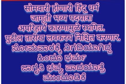 सोमवारी होणारी हिंदू धर्म जागृती भव्य पदयात्रा अपरिहार्य कारणामुळे स्थगित. पुढील तारीख लवकरच निश्चित करणार- ಸೋಮವಾರಕ್ಕೆ ನಿಗದಿಯಾಗಿದ್ದ ಹಿಂದೂ ಧರ್ಮ ಜಾಗೃತಿ ಭವ್ಯ ಪಾದಯಾತ್ರೆ ಮುಂದೂಡಿಕೆ