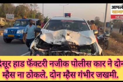 खानापूर-बेळगाव महामार्गावर हाड फॅक्टरी नजीक पोलीस कार दोन म्हैस ना धडकली. दोन्ही म्हैस गंभीर जखमी- ಖಾನಾಪುರ-ಬೆಳಗಾವಿ ಹೆದ್ದಾರಿಯಲ್ಲಿರುವ ಮೂಳೆ ಕಾರ್ಖಾನೆಯ ಬಳಿ ಪೊಲೀಸ್ ಕಾರು ಎರಡು ಎಮ್ಮೆಗಳಿಗೆ ಡಿಕ್ಕಿ ಹೊಡೆದ ಪರಿಣಾಮವಾಗಿ ಎರಡೂ ಎಮ್ಮೆಗಳಿಗೆ ಗಂಭೀರ ಗಾಯ.