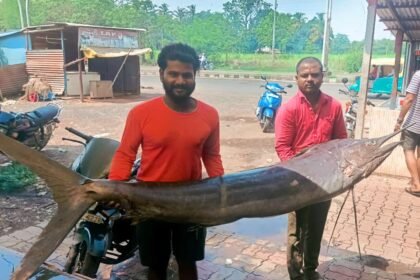 खानापूर फिश मार्केट मध्ये 80 किलोचा छत्री (तडसा) मासा-ಖಾನಾಪುರ ಮೀನು ಮಾರುಕಟ್ಟೆಯಲ್ಲಿ 80 ಕೆಜಿ ತೂಕದ (ತಡಸ) ಮೀನು.