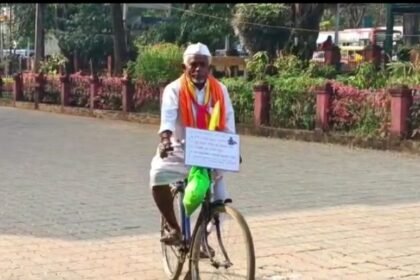 सिलिंडरचे दर कमी करावेत म्हणून वयोवृद्ध नागरिकाचे गोकाक ते बेळगाव सायकल चालवून जिल्हाधिकाऱ्यांना निवेदन