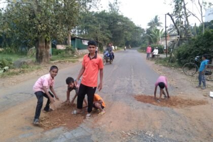 हेब्बाळ गावातील चिमुरडी धोकादायक खड्डे मुजवताना