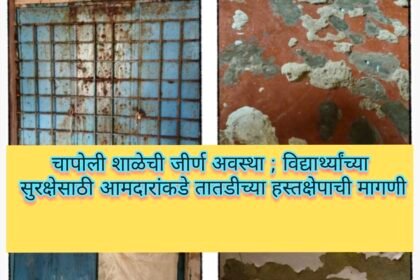 चापोली शाळेची जीर्ण अवस्था ; विद्यार्थ्यांच्या सुरक्षेसाठी आमदारांकडे तातडीच्या हस्तक्षेपाची मागणी+ಚಾಪೋಲಿ ಊರಿನ ಶಾಲೆಯ ಜೀರ್ಣ ಸ್ಥಿತಿ ; ವಿದ್ಯಾರ್ಥಿಗಳ ಸುರಕ್ಷತೆಗೆ ಶಾಸಕರ ತುರ್ತು ಮಧ್ಯಪ್ರವೇಶದ ಬೇಡಿಕೆ.