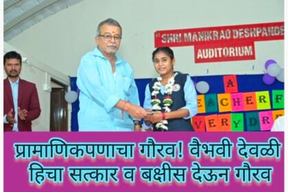 प्रामाणिकपणाचा गौरव! वैभवी देवळी हिचा सत्कार व बक्षीस देऊन गौरव-ಪ್ರಾಮಾಣಿಕತೆ ಮೆರೆದ ವಿದ್ಯಾರ್ಥಿ ವೈಭವೀ ದೇವಳಿಗೆ ಸನ್ಮಾನ.