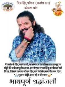 मंगळूर : (वृत्तसंस्था) मंगळूर येथे सुहास शेट्टी नावाच्या एका माजी बजरंग दल सदस्यावर गुरुवारी रात्री अज्ञातांनी हल्ला केल्याची घटना समोर आली आहे. या हल्ल्यात जखमी झालेल्या शेट्टीचा नंतर खाजगी रुग्णालयात उपचारादरम्यान मृत्यू झाला. दरम्यान गुन्हेगारी रेकॉर्ड असलेल्या शेट्टीवर मंगळुरू शहराला लागून असलेल्या एका गावात हा हल्ला झाला.