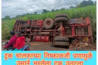 चालकाच्या निष्काळजीपणामुळे उसाने भरलेला ट्रक पलटी-ಚಾಲಕನ ನಿರ್ಲಕ್ಷ್ಯದಿಂದ ಕಬ್ಬು ತುಂಬಿದ ಟ್ರಕ್ ಪಲ್ಟಿ.
