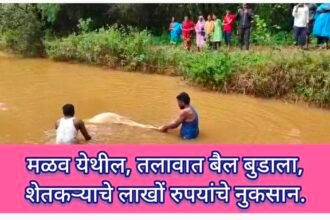 मळव येथील तलावात बैल बुडाला, शेतकऱ्याचे लाखों रुपयांचे नुकसान. ಮಾಳವ ದಲ್ಲಿ, ಆಕಳು ಕೆರೆಯಲ್ಲಿ ಮುಳುಗಿತು. ರೈತರಿಗೆ ಲಕ್ಷಾಂತರ ರೂಪಾಯಿ ನಷ್ಟವಾಗಿದೆ.
