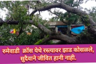 रुमेवाडी क्रॉस येथे रस्त्यावर झाड कोसळले, सुदैवाने जीवित हानी नाही-ರುಮೇವಾಡಿ ಕ್ರಾಸ್ನಲ್ಲಿ ಮರವೊಂದು ರಸ್ತೆಗೆ ಬಿದ್ದಿದ್ದು, ಅದೃಷ್ಟವಶಾತ್ ಯಾವುದೇ ಪ್ರಾಣಹಾನಿ ಸಂಭವಿಸಿಲ್ಲ.