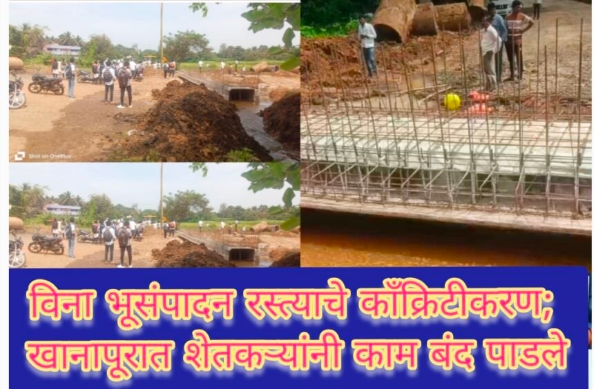 विना भूसंपादन रस्त्याचे काँक्रिटीकरण; खानापूरात शेतकऱ्यांनी काम बंद पाडले.