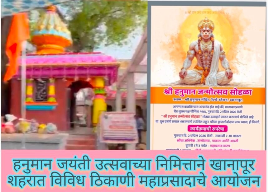 खानापूर : उद्या गुरुवार दिनांक 2 एप्रिल 2026 रोजी संपूर्ण देशभरात हनुमान जयंती उत्सव मोठ्या उत्साहात साजरा केला जाणार आहे. त्यानिमित्ताने खानापूर शहरातही विविध ठिकाणी हनुमान जयंती उत्सव, धार्मिक कार्यक्रम व महाप्रसादाचे आयोजन करण्यात आले आहे. भाविकांमध्ये उत्साहाचे वातावरण असून मंदिर परिसर सजविण्यात आले आहेत.