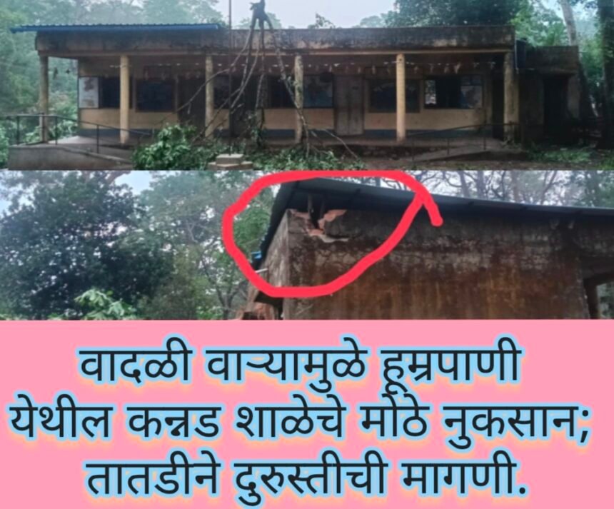 वादळी वाऱ्यामुळे हूम्रपाणी येथील कन्नड शाळेचे मोठे नुकसान; तातडीने दुरुस्तीची मागणी.