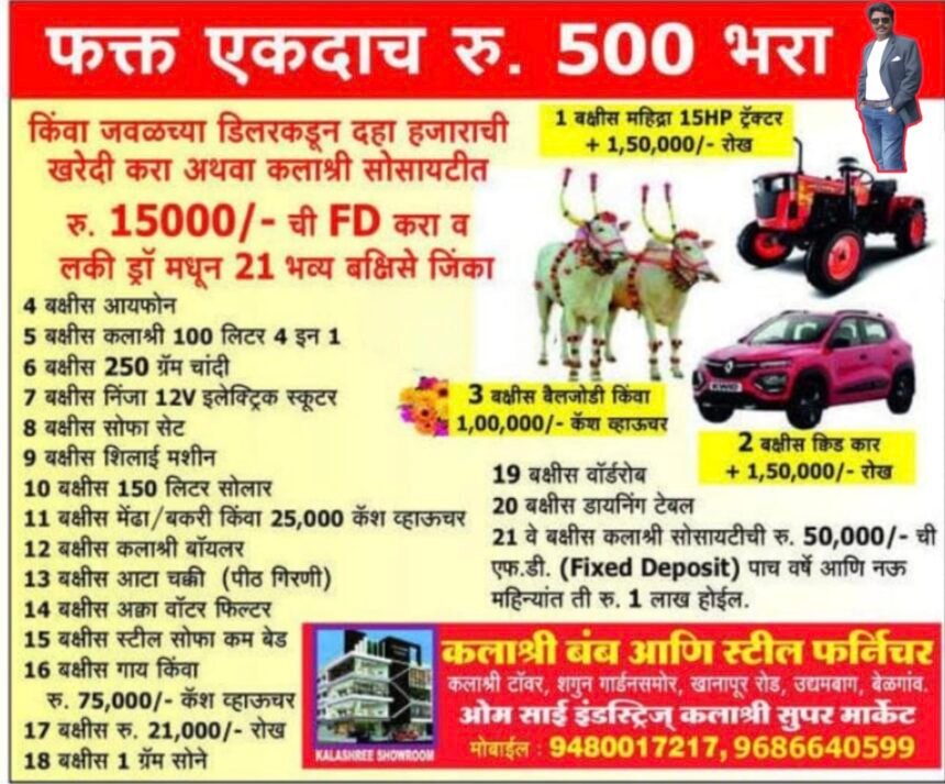 फक्त एकदाच 500 रुपये भरा आणि जिंका महागडी बक्षिसे; कलाश्री शोरूमकडून भव्य लकी ड्रॉ योजना.