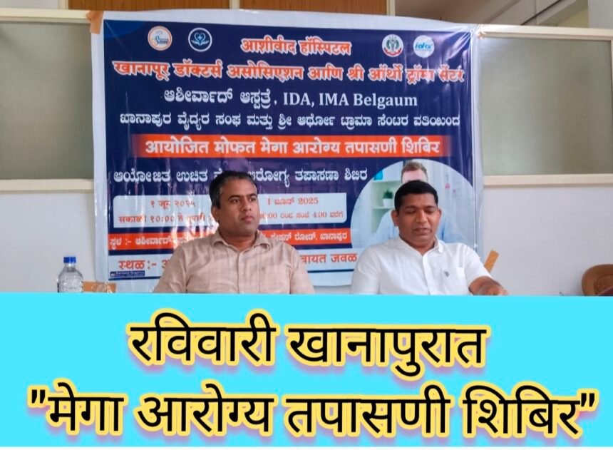 खानापूर ; आशीर्वाद हॉस्पिटल खानापूर आणि श्री ऑर्थो आणि ट्रामा सेंटर युनिट बेळगाव तसेच खानापूर डॉक्टर असोसिएशन यांच्या वतीने रविवार 1 जून 2025 रोजी सकाळी 10.00 ते दुपारी 4.00 पर्यंत मोफत “मेगा आरोग्य तपासणी” शिबिराचे आयोजन करण्यात आले असून या शिबिरामध्ये वेगवेगळ्या व सर्व प्रकारच्या रोगावर उपचार करणारे डॉक्टर तपासणी करणार असल्याची माहिती खानापूर तालुका डॉक्टर असोसिएशनचे अध्यक्ष डॉ. डी ई नाडगौडा व आशीर्वाद हॉस्पिटलचे मॅनेजिंग डायरेक्टर डॉक्टर देवगौडा यांनी आज बोलाविलेल्या पत्रकार परिषदेत माहिती दिली. तसेच या शिबिरामध्ये यशस्वीनी आरोग्य विमा, धर्मस्थळ आरोग्य विमा, आयुष्यमान भारत आरोग्य, कर्नाटक बीपीएल एपीएल कार्ड धारक तसेच हरीश योजना (अपघातग्रस्तासाठी) या योजनाखाली सुद्धा या ठिकाणी उपचार करण्यात येणार असल्याचे त्यांनी सांगितले.