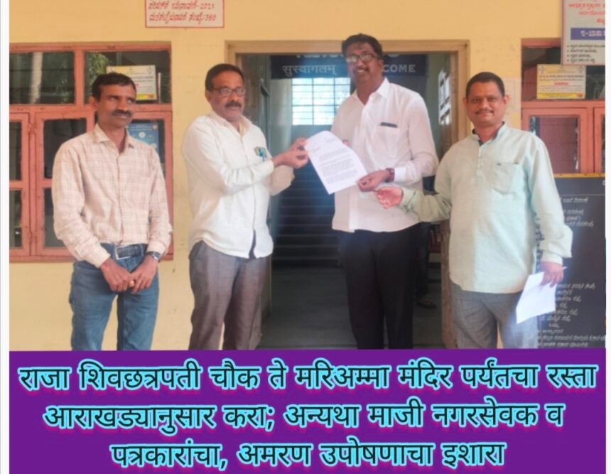 राजा शिवछत्रपती चौक ते मरिअम्मा मंदिर पर्यंतचा रस्ता आराखड्यानुसार करा; अन्यथा माजी नगरसेवक व पत्रकारांचा, अमरण उपोषणाचा इशारा-ರಾಜಾ ಶಿವಛತ್ರಪತಿ ವೃತ್ತದಿಂದ ಹಲಕರ್ಣಿ ಕ್ರಾಸ್ ಮರಿಯಮ್ಮ ದೇವಸ್ಥಾನವರೆಗೆ ರಸ್ತೆ ಕಾರ್ಯವನ್ನು ಅನುಮೋದಿತ ನಕ್ಷೆಯಂತೆ ಕೈಗೊಳ್ಳಬೇಕು; ಇಲ್ಲದಿದ್ದರೆ ಮಾಜಿ ನಗರಸಭಾ ಸದಸ್ಯರು ಹಾಗೂ ಪತ್ರಕರ್ತರಿಂದ ಅನಿರ್ದಿಷ್ಟಾವಧಿ ಉಪವಾಸ ಸತ್ಯಾಗ್ರಹದ ಎಚ್ಚರಿಕೆ