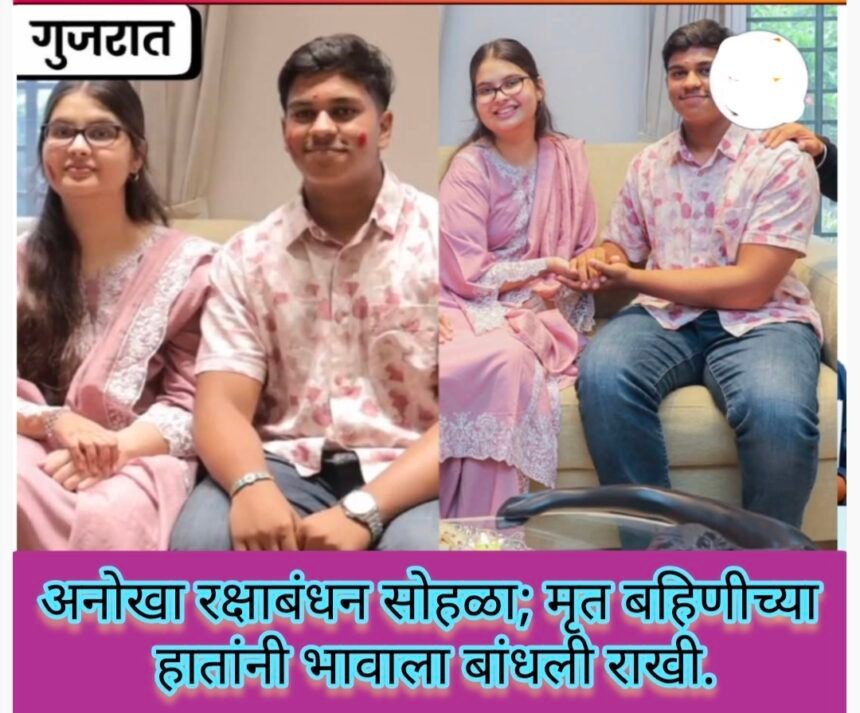 वलसाड (गुजरात) – रक्षाबंधनाच्या पावन सणाला वलसाड येथे घडलेला एक अनोखा प्रसंग सर्वांच्या डोळ्यांत अश्रू आणणारा ठरला. यंदाचा हा रक्षाबंधन सोहळा वेगळा आणि भावनिक होता, कारण एका बहिणीच्या निधनानंतरही तिच्या हातांनी भावाला राखी बांधली गेली.