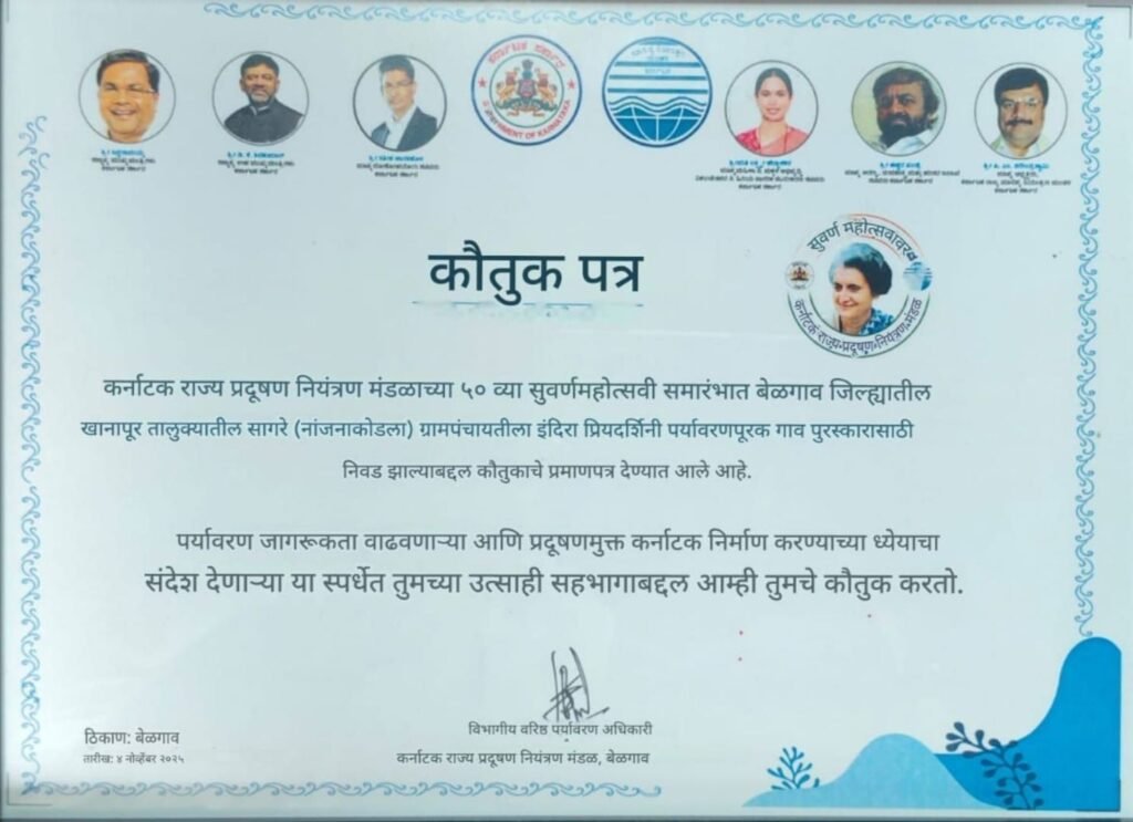 खानापूर (ता. 4 नोव्हेंबर) : खानापूर तालुक्यातील नंजीनकोडल ग्रामपंचायत हद्दीतील सागरे गावाची “पर्यावरणपूरक व स्वच्छ ग्राम” या राज्यस्तरीय पुरस्कारासाठी निवड झाली असून, या पुरस्काराने संपूर्ण तालुक्याचा मान वाढविला आहे. हा पुरस्कार बेळगावचे पालकमंत्री व कर्नाटक राज्याचे सार्वजनिक बांधकाम मंत्री श्री. सतीश जारकीहोळी यांच्या हस्ते प्रदान करण्यात आला.