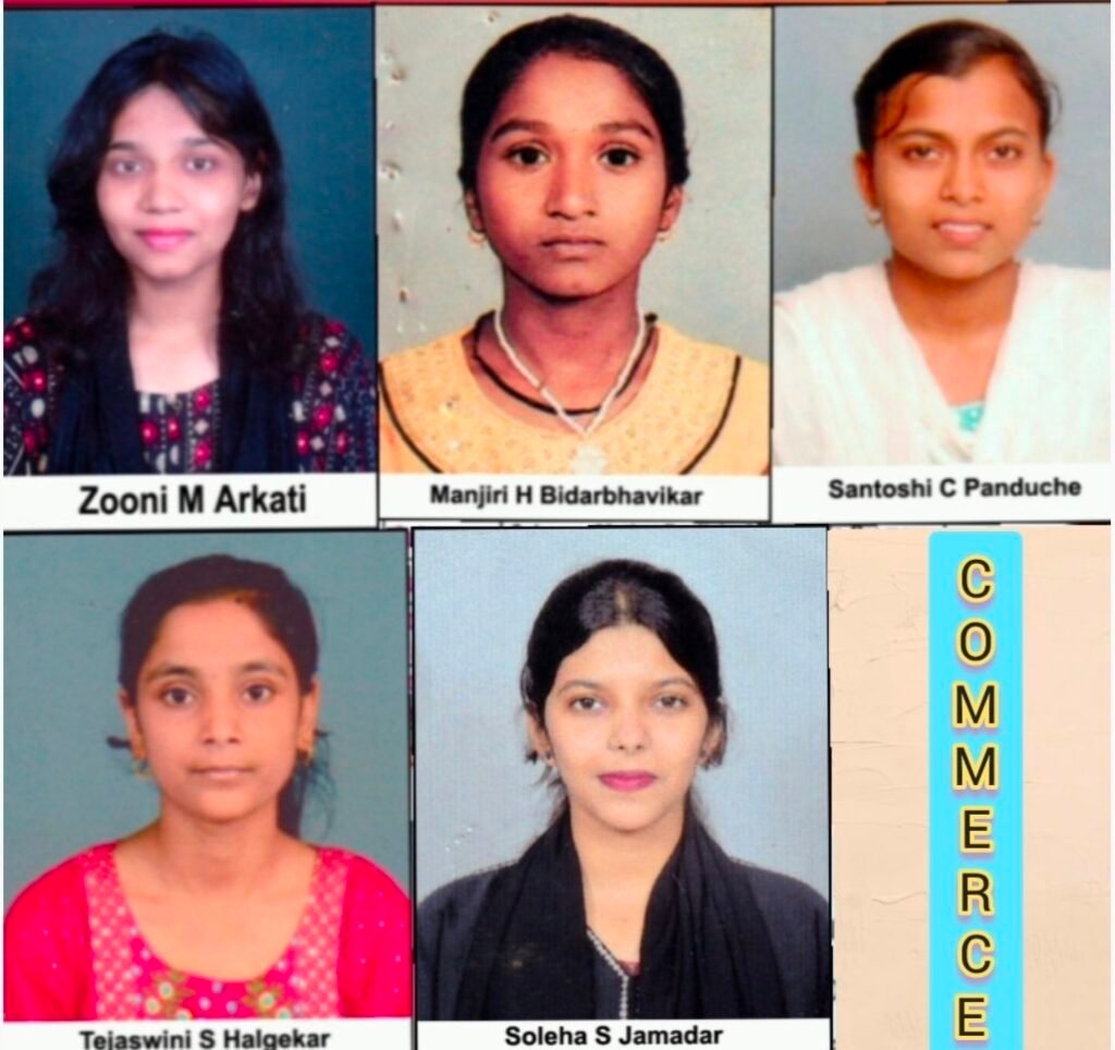 वाणिज्य विभागात कुमारी झुनी आरकाटी हिने प्रथम क्रमांक पटकावला असून कुमारी मंजिरी बिदरभावी हिने द्वितीय तर कुमारी संतोषी पांडूचे हिने तृतीय क्रमांक मिळविला आहे. तर तेजस्विनी एस हलगेकर हिने चौथा क्रमांक पटकावला असून पाचवा क्रमांक सोलेहा एस जमादार तिने पटकावला आहे.