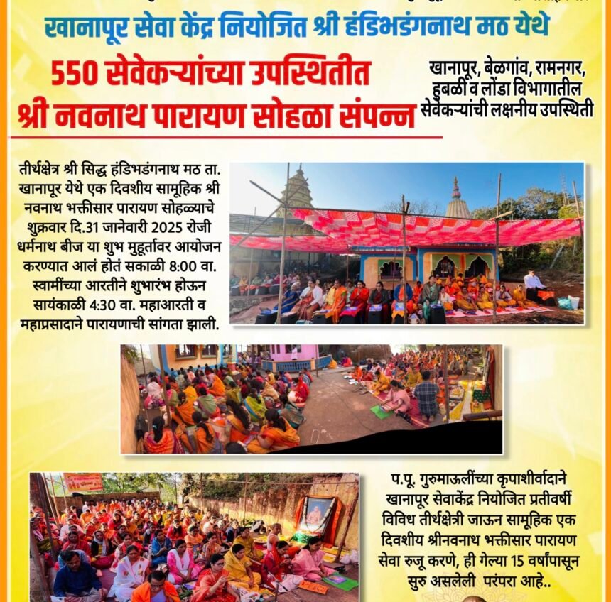 ಖಾನಾಪುರದ ಸ್ವಾಮಿ ಸಮರ್ಥ ಕೇಂದ್ರದಿಂದ ಆಯೋಜಿಸಲಾಗಿದ್ದ ಶ್ರೀ ಸಿದ್ಧ ಹಂಡಿಭದಂಗನಾಥ ಮಠದಲ್ಲಿ ನಡೆದ ನವನಾಥ ಪಾರಾಯಣದಲ್ಲಿ 550 ಭಕ್ತರು ಭಾಗಿ.