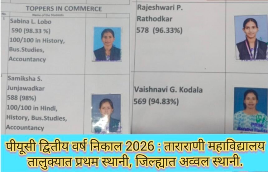पीयूसी द्वितीय वर्ष निकाल 2026 : ताराराणी महाविद्यालय तालुक्यात प्रथम स्थानी, जिल्ह्यात अव्वल स्थानी.