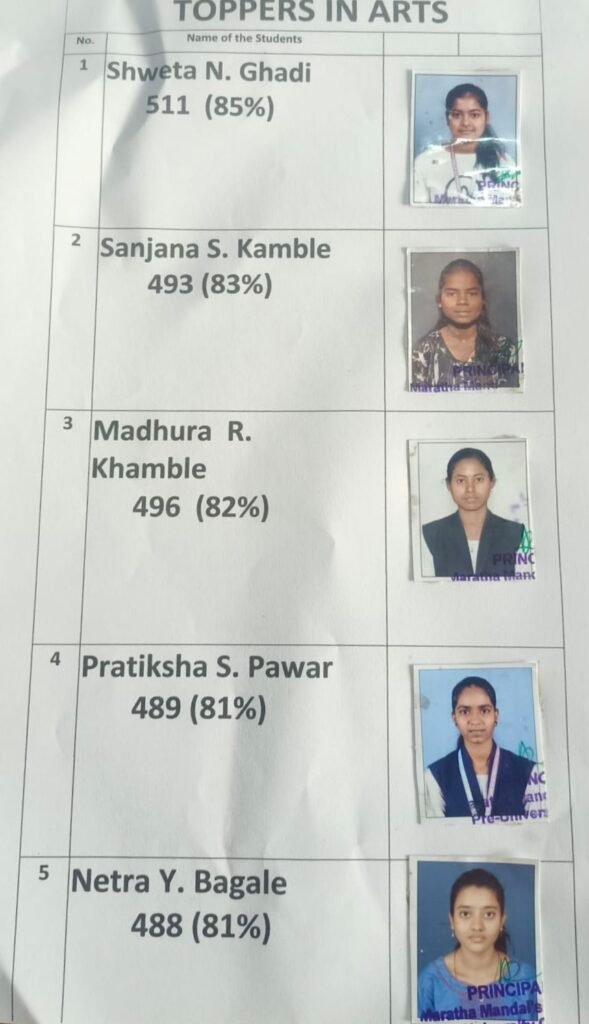कला विभागात कुमारी स्वेता एन. घाडी (85%) हिने प्रथम क्रमांक पटकावला. तसेच कुमारी संजना एस. कांबळे (83%), कुमारी मधुरा आर. खांबळे (82%), कुमारी प्रतिक्षा एस. पवार (81%) व कुमारी नेत्रा वाय. बागले (81%) यांनीही उल्लेखनीय यश मिळवले. कला विभागाचा एकूण निकाल 75.92% लागला आहे.