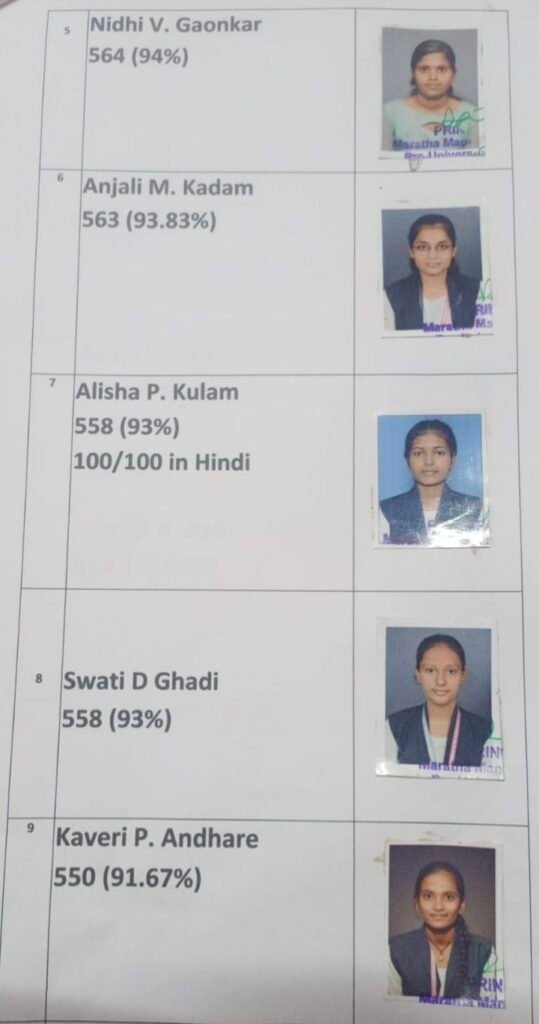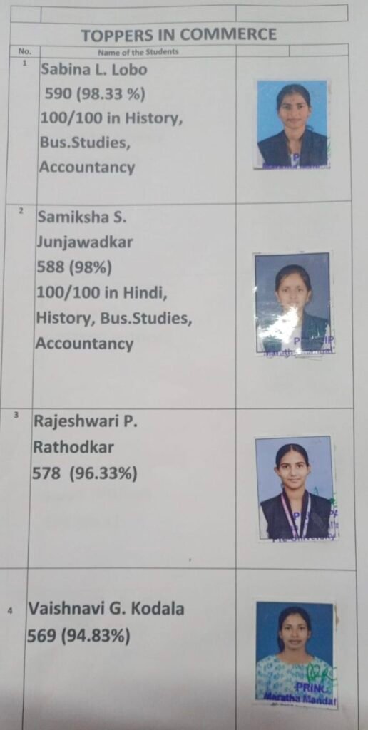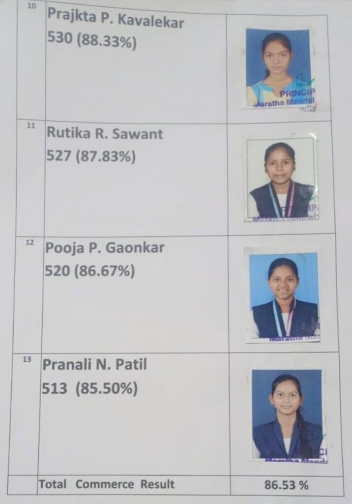 तसेच कुमारी वैश्नवी जी. कोडला (94.83%), कुमारी निधी व्ही. गवाणकर (94%), कुमारी अंजली एम. कदम (93.83%), कुमारी अलिशा पी. कुलकर्णी (93%), कुमारी स्वाती डी. घाडी (93%), कुमारी कावेरी पी. अंधारे (91.67%), कुमारी प्राजक्ता पी. कावळेकर (88.33%), कुमारी ऋतुजा आर. सावंत (87.83%), कुमारी पूजा पी. गवाणकर (86.67%) व कुमारी प्रांजल एन. पाटील (85.50%) यांनीही उल्लेखनीय यश संपादन केले. वाणिज्य विभागाचा एकूण निकाल 86.53% लागला आहे.