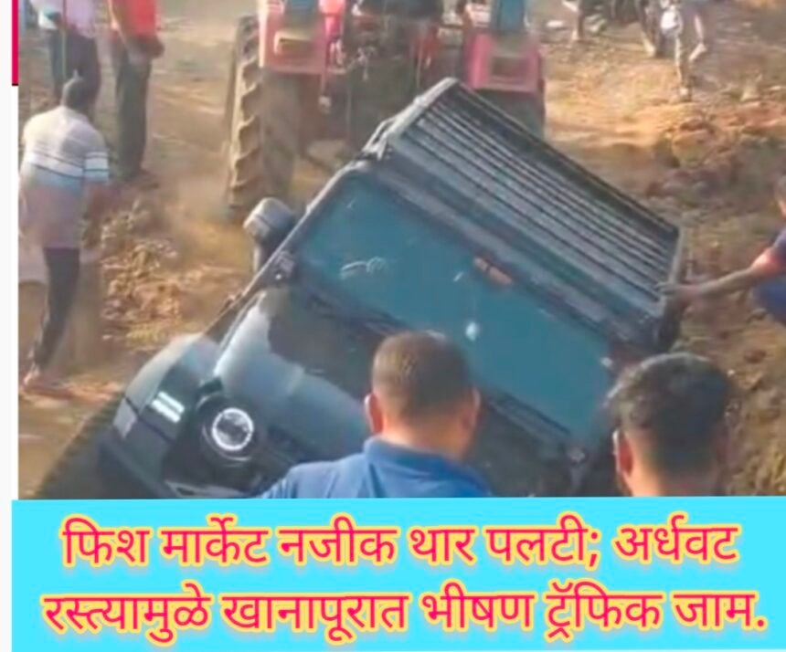 फिश मार्केट नजीक थार पलटी; अर्धवट रस्त्यामुळे खानापूरात भीषण ट्रॅफिक जाम. आमदार व खासदारांनी प्रलंबित प्रश्न सोडविण्याची नागरिकांची मागणी.