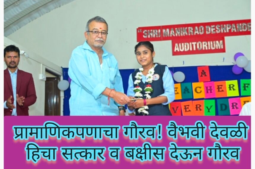 शिक्षक दिनाचे औचित्य साधून आयोजित कार्यक्रमात वैभवीचा समाजसेवक जयंत तिनेकर यांच्या हस्ते रोख बक्षीस देऊन गौरव करण्यात आला. शिक्षण संस्थेचे अध्यक्ष व वकील चेतन मनेरिकर यांनी वैभवीच्या प्रामाणिकपणाचे विशेष कौतुक केले.