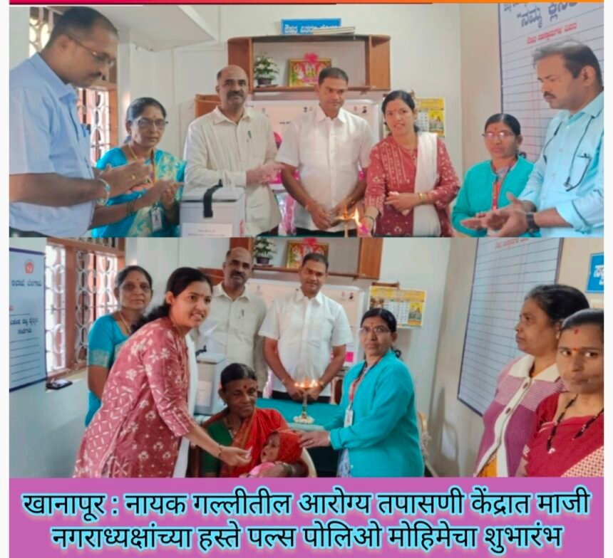 खानापूर ; खानापूर शहरातील नायक गल्ली येथील आरोग्य तपासणी केंद्रात पल्स पोलिओ लसीकरण कार्यक्रम उत्साहात पार पडला. या कार्यक्रमाचा शुभारंभ खानापूर नगरपंचायतीच्या माजी नगराध्यक्ष श्रीमती मीनाक्षी बैलूरकर यांच्या हस्ते करण्यात आला. त्यांनी लहान मुलांना पोलिओ प्रतिबंधक लसीचे दोन थेंब देऊन मोहिमेला औपचारिक सुरुवात केली.